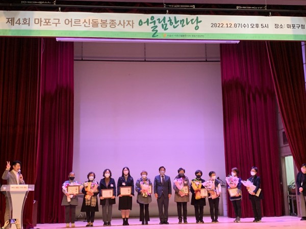 '제4회 마포구 어르신돌봄종사자 어울림 한마당'을 기념하여, 마포구청과 서울시 어르신돌봄종사자종합지원센터에서 모범 어르신돌봄종사자를 표창하였습니다.