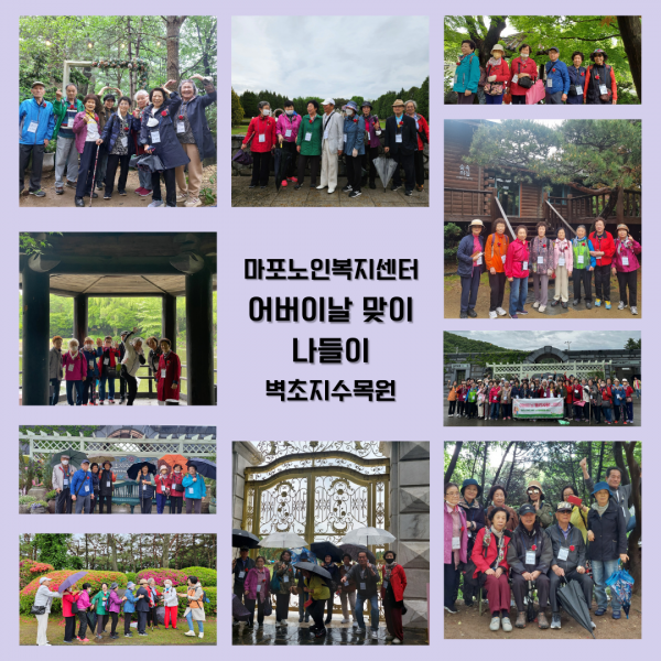 마포노인복지센터에서는 어버이날을 맞아 어르신들을 모시고 파주 벽초지 수목원으로 나들이를 다녀왔습니다. 비록 좋은 날씨는 아니었으나 어르신들이 오히려 운치가 좋다며 밝은 모습으로 꽃을 구경하셨습니다.