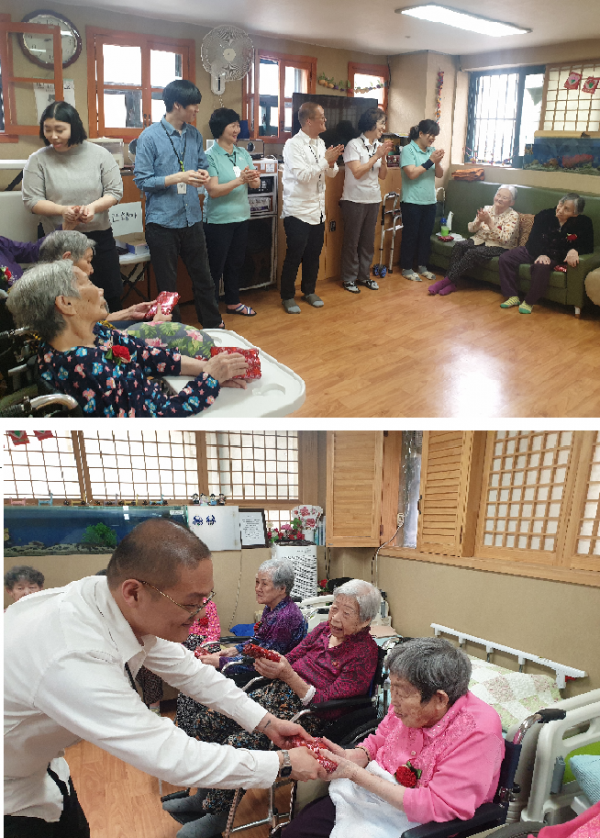 직원들도 어버이날을 기념하여 어르신들과 함께 "어머니 마음"를 부르며 어머니의 기억을 함께 떠 올려보는 시간을 갖었습니다. 어버이 은혜에 감사함을 작은 선물로 대신해 봅니다. 어르신들 오래오래 항상 건강하셨음 좋겠습니다.