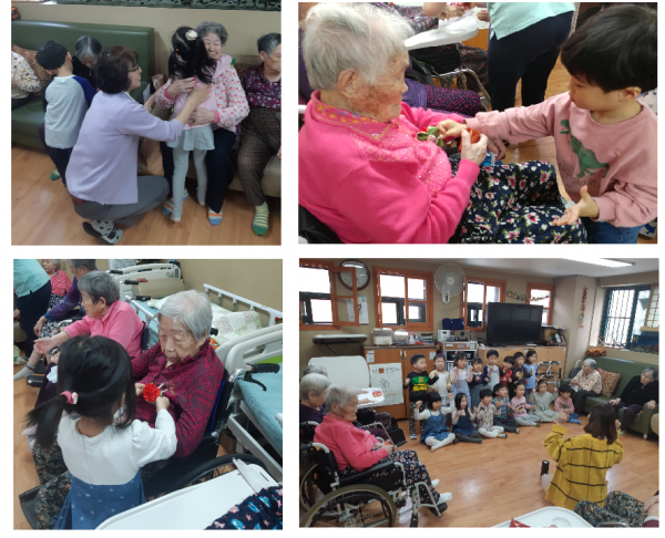 선물을 받고 기뻐하는 원아들과 어르신들 어버이날을 맞아 즐거운 시간을 보냈습니다.