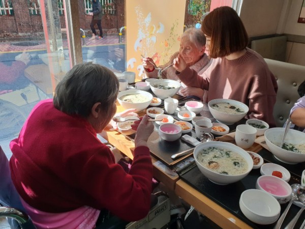 죽을 맛있게 드시고 외부 음식점까지 데려와서 식사를 제공하는 것에 대해 고맙다고 말씀하십니다.