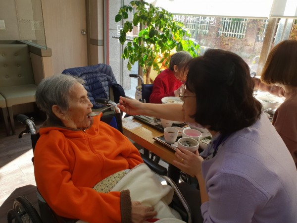 어르신들은 메뉴판을 보시고 선호하는 미역죽과 야채죽을 고르십니다.