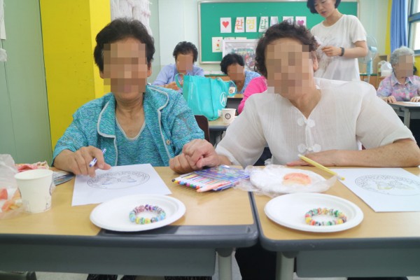 첫번째 시간에는 알록달록 팔찌를 만들었는데요. 낚시줄에 구슬을 끼우기 위해 집중하는 어르신들의 모습을 볼 수 있었습니다. 낚시줄을 실수로 놓쳐서 구슬이 다 빠져나가도 '하하, 호호' 웃으며 즐거운 시간이 되었습니다.