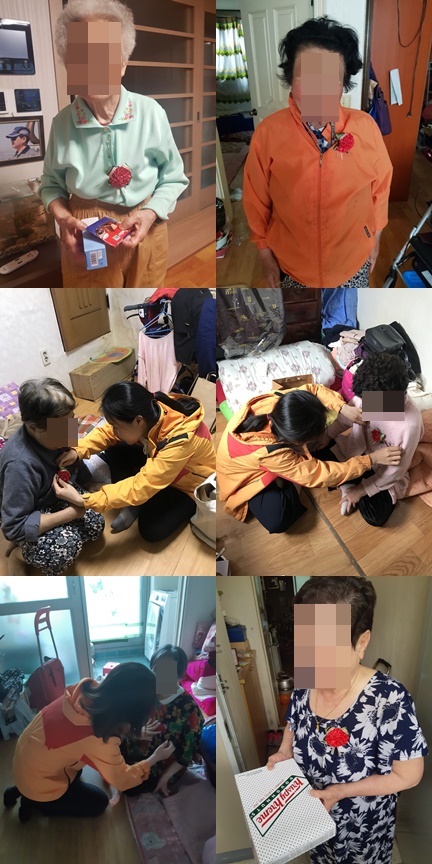 어버이날을 맞이하여 홀로 살고 계시는 어르신들을 찾아가 예쁜 카네이션을 달아드렸습니다. 봉사자님들과 함께 어버이 은혜 노래를 부르고 큰 절까지 드리니 어르신들께서는 함박 웃음을 지으셨습니다. 후원품인 로션과 초콜렛을 함께 드리니 기쁨은 배가 되었습니다~ 어르신들 어버이 은혜 감사합니다~^^