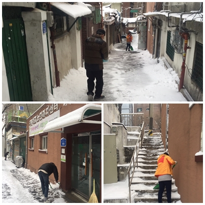 큰 길로 나가는 경사가 있는 길과 지역주민들이 자주 오가는 계단이 미끄럽지 않게 쓸어야만