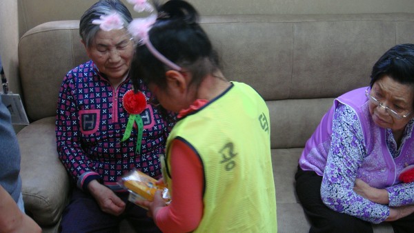 아이들은 노래를 부른 후에 어르신들에게 카네이션을 달아드렸고, 어르신들은 어린이날을 축하하는 의미로 아이들에게 빵과 음료를 전달하였습니다.