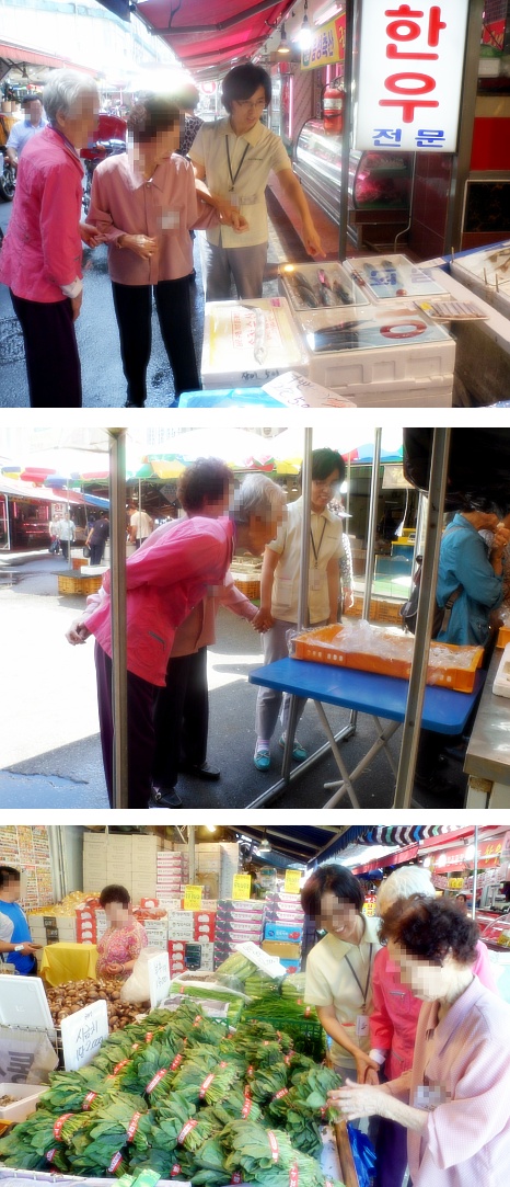 어르신들과 간호팀장님, 사회복지사가 시장 나들이를 하였습니다.