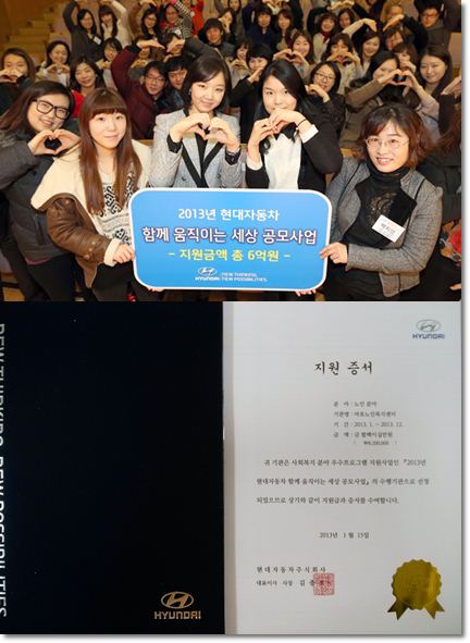 2013년 현대자동차 함께 움직이는 세상 공모사업 지원금 전달식이 있었습니다.