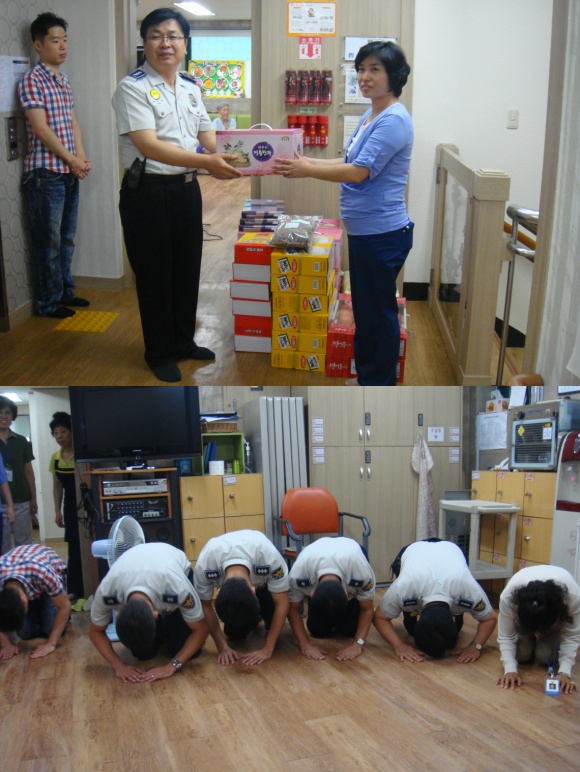 2011.09.09 추석을 맞이하여 관내 마포경찰서 서장님과 직원들이 래방하여 어르신들께 추석 인사를 드리고 과일과 한과,식혜등 다양한 후원품들을 보내주셨습니다. 감사합니다.~