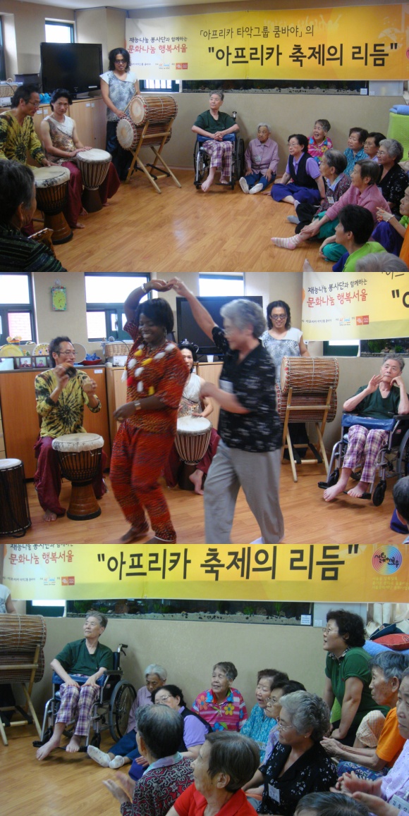 폭발적인 타악기 연주소리와 흑인여성의 현란한 춤솜씨에 매료되어 신나는 시간을 보낸 울 어르신들이 모두들 한마디씩 하시네요 "아프리카사람 ~ 발을 엄청 빨리 놀리네~ "