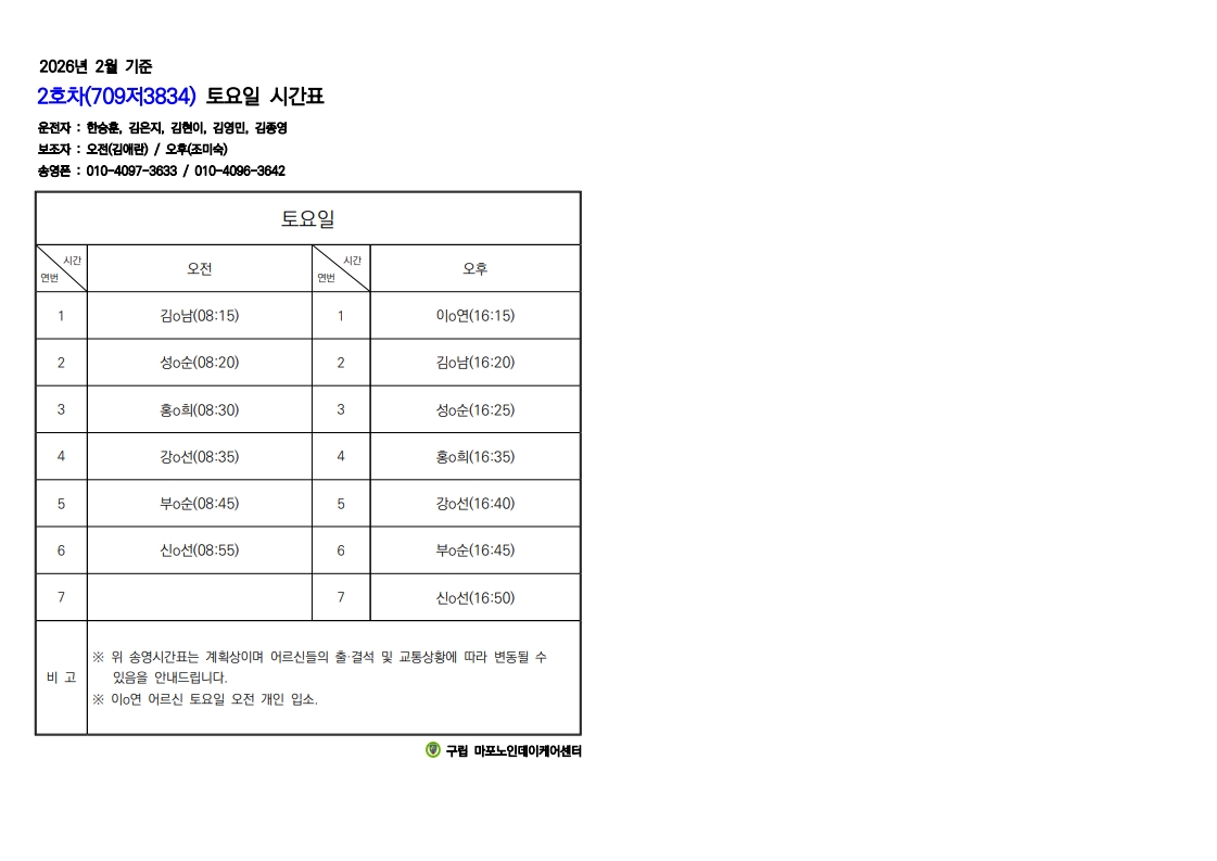 2026년 2월 이동서비스 시간표