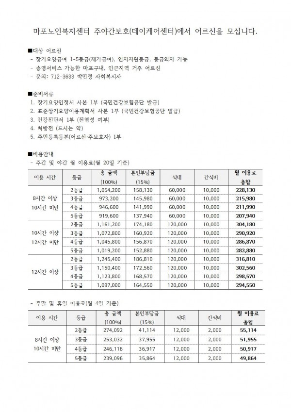 주야간보호(데이케어센터)에서 어르신을 모십니다.