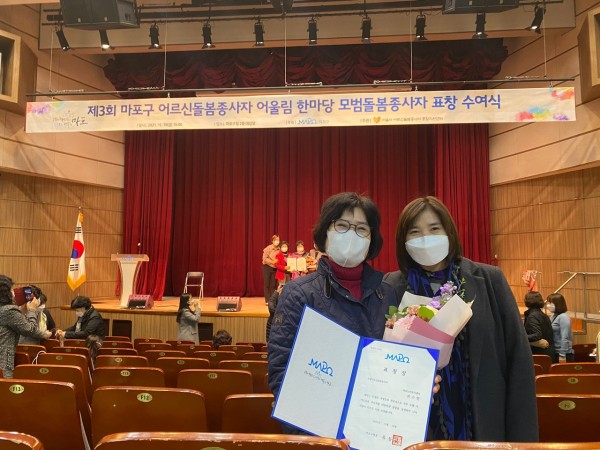 '제3회 마포구 어르신돌봄종사자 어울림 한마당'을 기념하여, 마포구청과 서울시 어르신돌봄종사자종합지원센터에서 모범돌봄종사자를 표창하였습니다.