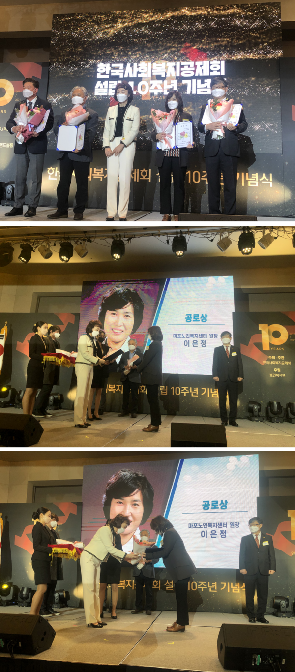 4) 내 용 : 이은정 원장님께서 한국사회복지공제회 10주년 기념식에서 그 동안의 공로를 인정받아 공로상을 수상하였습니다. 앞으로도 사회복지의 발전과 사회복지 종사자들의 처우 개선, 어르신들의 행복을 위해 최선을 다하는 마포노인복지센터가 되겠습니다. 감사합니다.