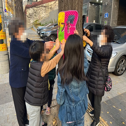 참여자들은 뜨개옷이 입혀진 나무를 보면서