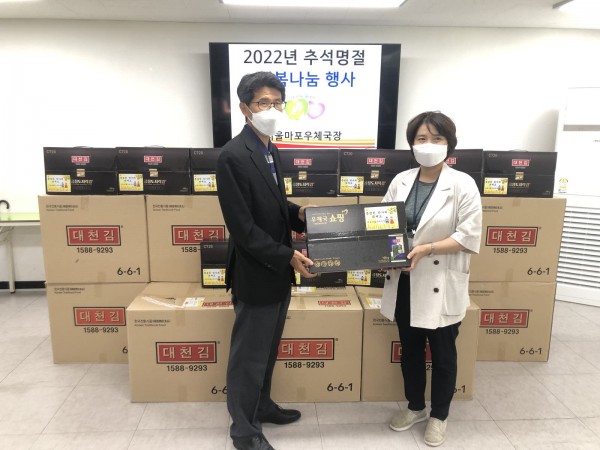 마포우체국에서 검은 호랑이띠 추석을 맞이하여 후원물품(김선물세트) 135세트를 전달해 주셨습니다. 이 물품은 취예계층 어르신들 135가정에 전달할 예정입니다.