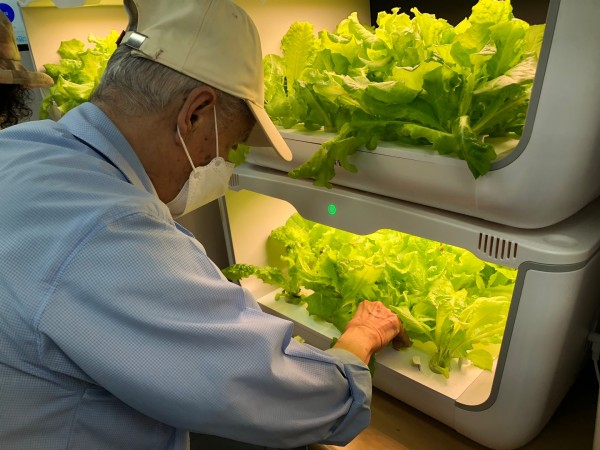 스마트팜 기기를 활용하여 상추를 재배하여 수확하며 즐거움을 느끼십니다.