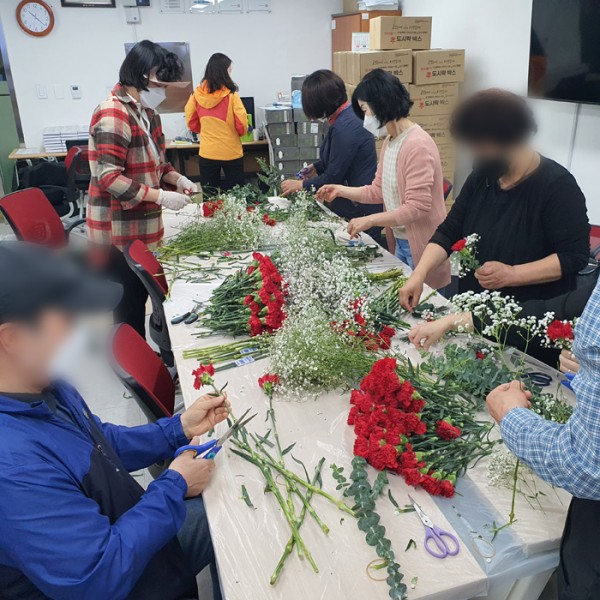 2021년 어버이날을 기념하여 카네이션 코사지를 제작하여 전달해드렸습니다.