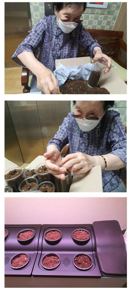 실내 텃밭을 만들어 무더운 여름날과 코로나로 외부활동이 어려운 이때 실내에서의 다채로운 활동을 계획하였습니다. 씨앗을 심고 스마트팜에 LED 조명이 내리쬐는 모습을 보시곤 어르신께선 "과학적으로 키우는 거야"하시며, 신기하신듯 바라 보십니다.