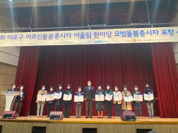 '제3회 마포구 어르신돌봄종사자 어울림 한마당'을 기념하여, 마포구청과 서울시 어르신돌봄종사자종합지원센터에서 모범돌봄종사자를 표창하였습니다.