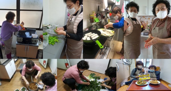 각 동아리 어르신들께서 모여 반찬을 만드는 시간을 가졌습니다. 미리 어르신들께서 제출해주신 활동계획서를 바탕으로 식재료를 주문하였고, 생활지원사를 통해 식재료 및 활동물품을 배분하였습니다. 앞치마, 마스크 착용을 하고 손세척 후 프로그램을 시작하였습니다. 서로 분담하여 재료 손질을 하였고, 도란도란 이야기를 나누며 화기애애하게 진행되었습니다. 이렇게 여럿이 모여 반찬을 만드니 너무 즐겁다고 말씀하십니다. 완성된 반찬을 맛보며 너무 맛있다며, 평상시보다 더 맛있게 만들어졌다며 환하게 웃으십니다. 준비해 둔 반찬통에 반찬을 담고 맛있게 드시라는 영상과 함께 주변참여자 생활지원사에게 반찬과 영상을 함께 건내 주었습니다.