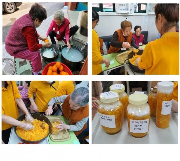 어르신들이 오렌지 씻기부터 유리병에 담기까지 함께해 주셨습니다.