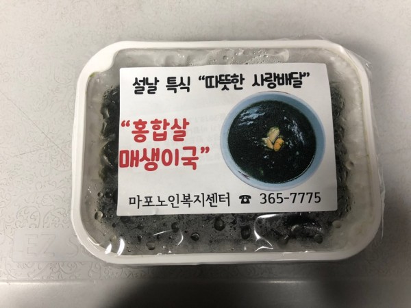 마포노인복지센터는 1월 31일 설을 맞이하여 저소득 및 홀로 사는 대상 어르신들의 경제적 부담 경감 및 풍성한 밑반찬 지원을 위해 "홍합살매생이국"을 제공해드렸습니다!