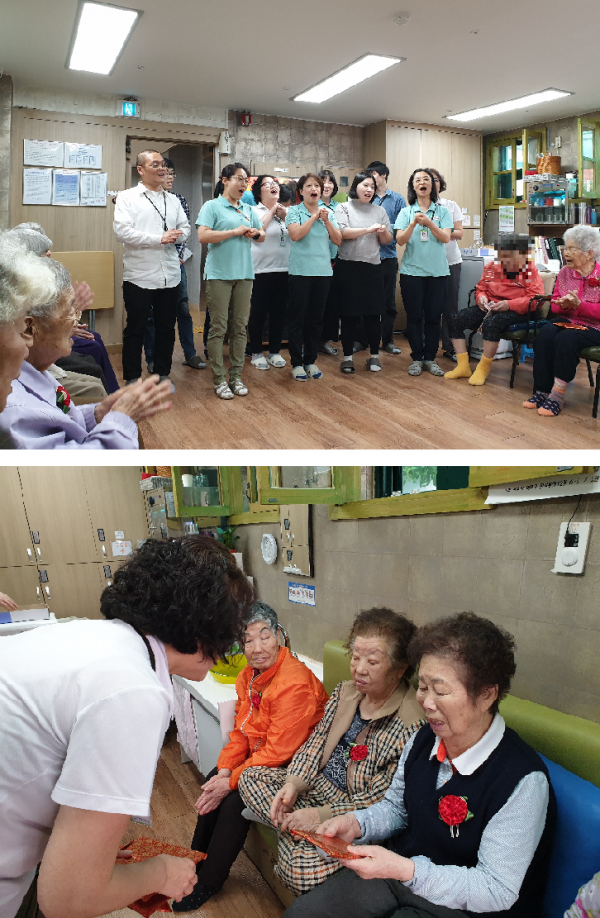 직원들이 어버이날을 맞이하여 어르신들에 대한 감사한 마음을 담아 "어머니의 마음"을 열창하고 있습니다.