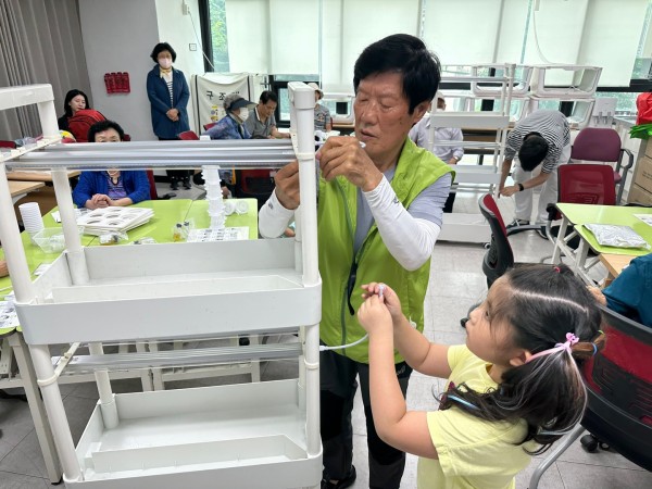 어르신들과 공덕어린이집 아동들이 힘을 합쳐 담당자의 설명을 들으며 기기를 조립했습니다.