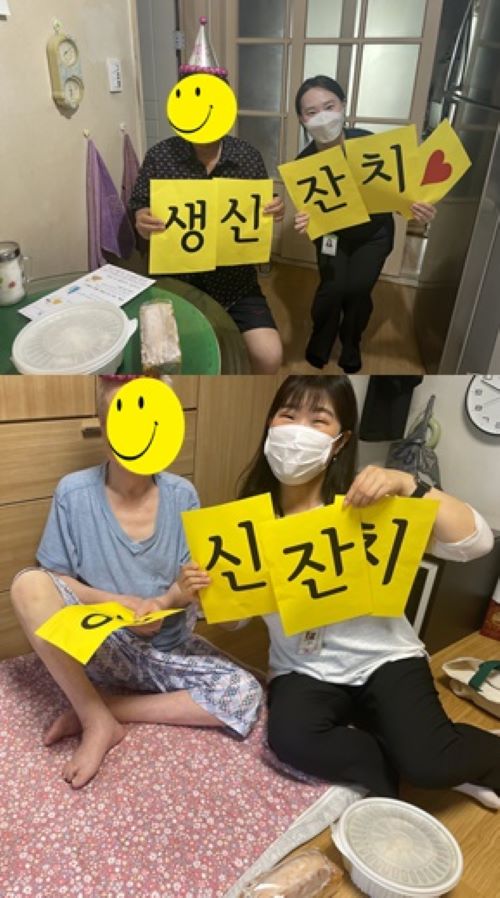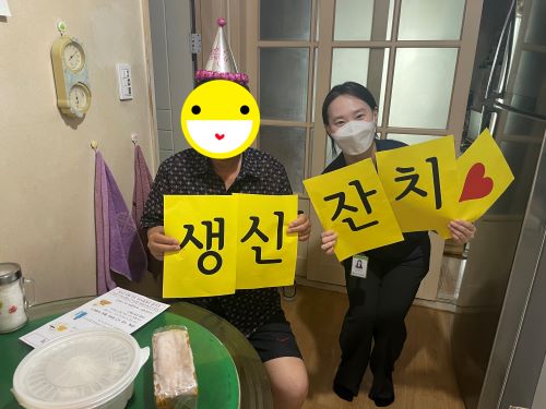 폭염과 장마가 시작되어 집 안에 가만히 앉아 있는 것만으로도 지치는 요즘 날씨에, 센터에서 이렇게 생일까지 챙겨주어 고마움을 표현해주셨습니다.