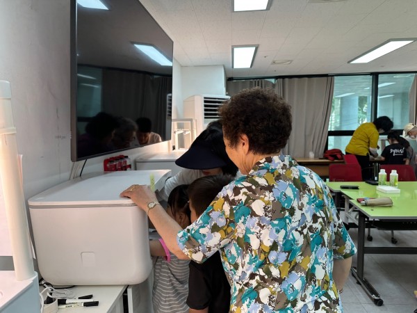담당자의 설명에 따라 상추 새싹을 바스켓에 심으면서 어려워하는 아동들을 어르신들이 도와서 성공적으로 심었습니다. 새싹을 심은 바스켓을 트레이에 배치하면서 잘 자라라고 말을 해주었습니다.