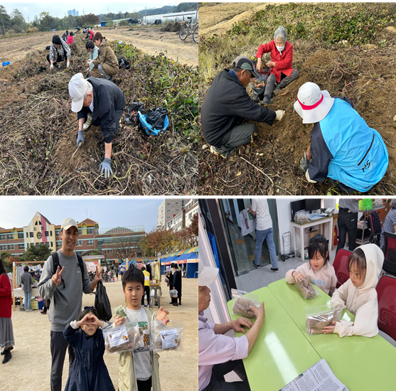 맛있는 점심을 함께 먹고, 도란도란 이야기를 나누며 호미로 고구마를 캐기 시작합니다.