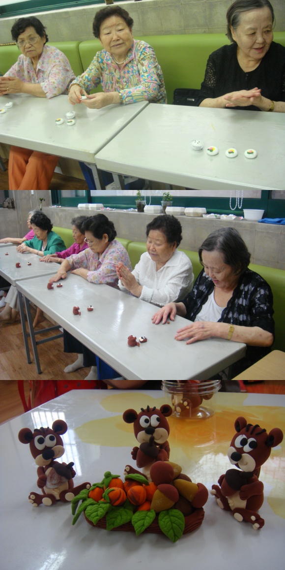 매월 첫째,둘째 수요일 오전에 진행되는 점핑클레이시간, 손톱만하게 점토를 손바닥으로 굴리고 모양을 내서 작품을 만드시는 어르신들~ 첫주에는 여러가지 떡을 만드시고, 둘째주에는 다람쥐를 만드셨어요. 너무 신기해하시고 손주준다며 꼭 챙겨 가신답니다