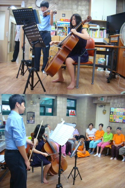 최지윤,최승일 남매가 우리센터 어르신들을 위해 현악 2중주 연주를 해주셨습니다. 늘 민요나 가요가 친숙한 어르신들이 새로움을 느끼실 수 있는 좋은 시간이었습니다. 2010.08.02