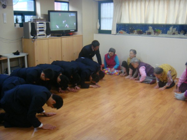 2010년 2월11일 홍익대학교 학군단학생들이 센터를 방문, 어르신들께 세배도 드리고 정성어린 후원물품도 전해주었습니다. 씩씩하고 잘생긴 학생들이 마치 손주처럼 느껴지신 듯 우리 어르신들도 매우 반가워 하셨답니다. 매달 정기적인 봉사도 약속해 주셔서 더욱 감사합니다.