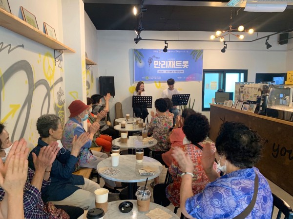 그래서 우리 복지센터는 독거어르신들을 모시고, 8월 한 달 동안 동네 카페에서 ‘만리재트롯’이라는 미니 라이브콘서트를 기획했습니다.
