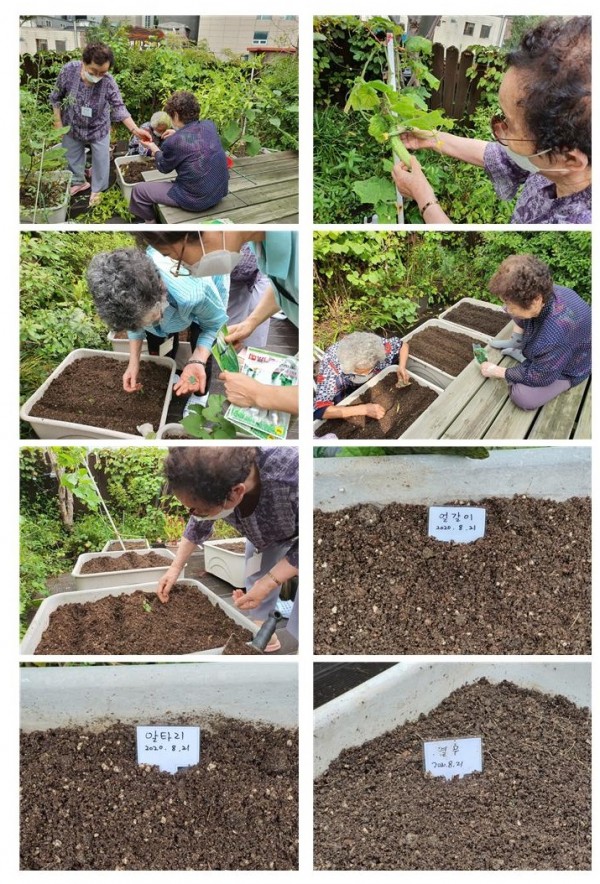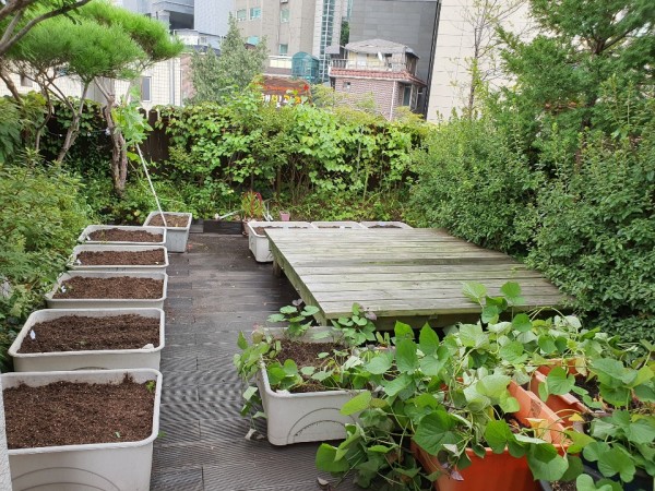 파종을 하니 햇빛정원이 깔끔해졌습니다. 고구마도 잘 자라라고 북돋아 줍니다.