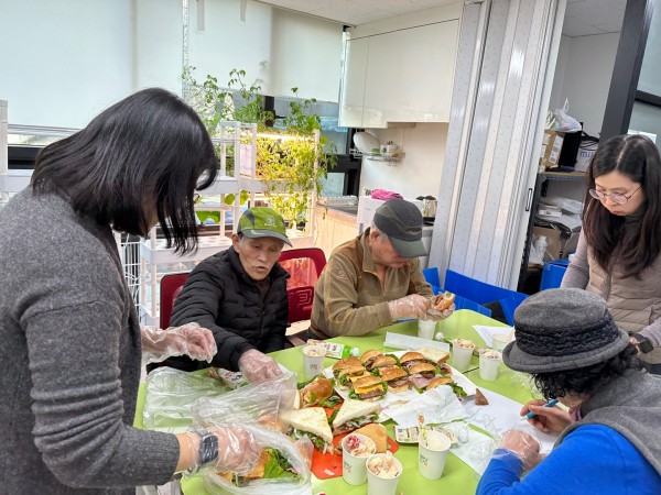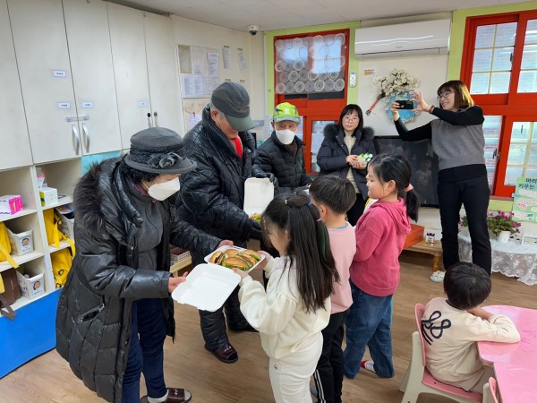 맛있게 만든 햄버거와 샐러드를 잘 포장하여 어린이집, 키움센터에 방문하여 어르신들께서