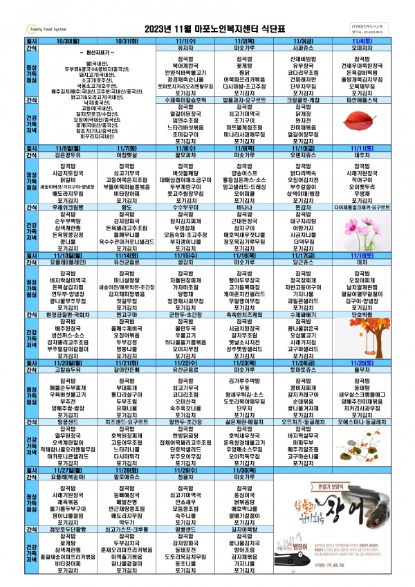 2023년 11월 식단표 페이지 정보 작성자 마포노인 작성일23-10-30 11:01 조회844회 댓글0건 관련링크 이전글 다음글 목록 본문 2023년 11월 식단표 안내드립니다. ^_^ 댓글목록 등록된 댓글이 없습니다. 이전글 다음글 목록
