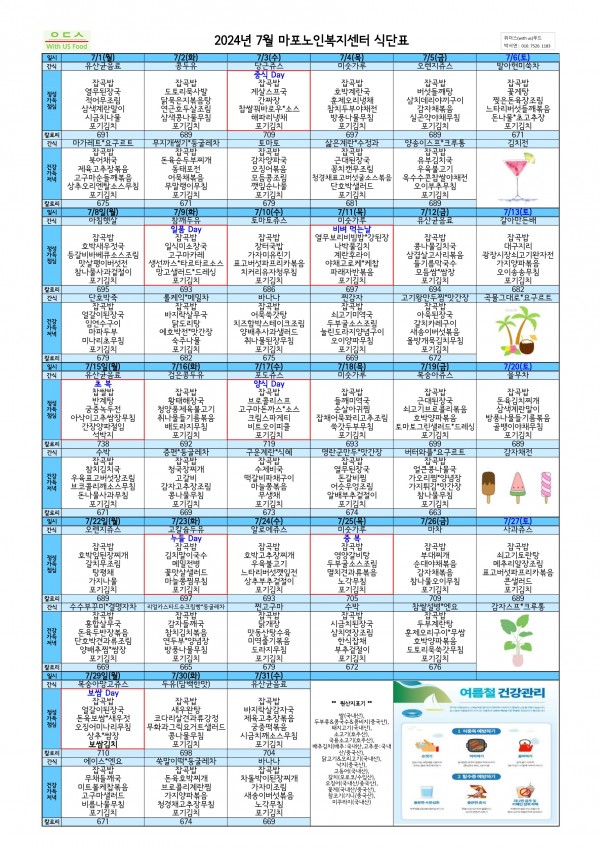 2024년 7월 식단표 페이지 정보 작성자 마포노인 작성일24-06-24 17:06 조회386회 댓글0건 관련링크 다음글 목록 본문 2024년 7월 식단표 안내드립니다. ^-^ * 식단표를 클릭하시면 원본크기로 확인하실 수 있습니다. 댓글목록 등록된 댓글이 없습니다. 다음글 목록