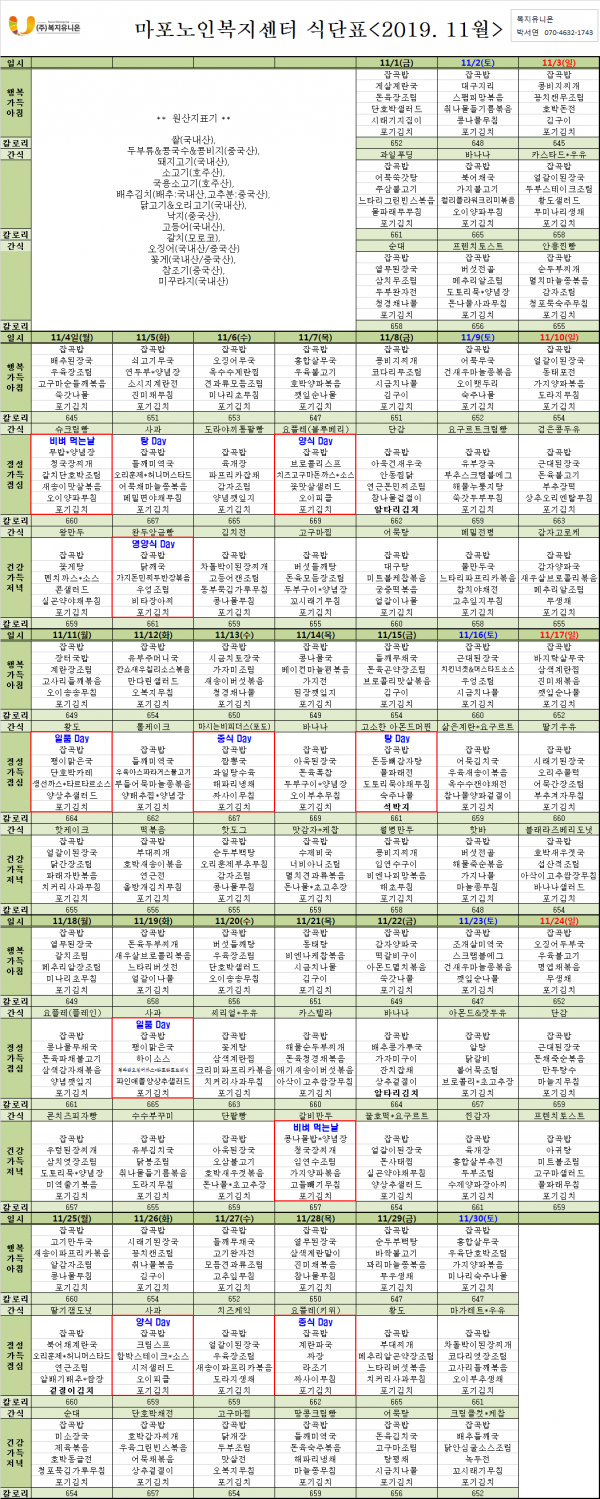 2019년 11월 식단표입니다. 페이지 정보 작성자 마포복지 작성일19-11-01 15:56 조회1,520회 댓글0건 관련링크 이전글 다음글 목록 본문 2019년 11월 식단표 댓글목록 등록된 댓글이 없습니다. 이전글 다음글 목록