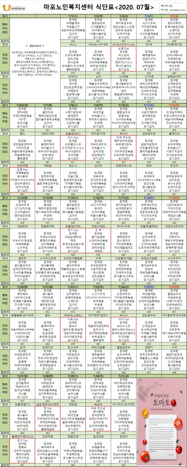 2020년 7월 식단표 안내 페이지 정보 작성자 마포노인 작성일20-07-02 12:21 조회1,359회 댓글0건 관련링크 이전글 다음글 목록 본문 2020년 7월 식단표 안내 댓글목록 등록된 댓글이 없습니다. 이전글 다음글 목록