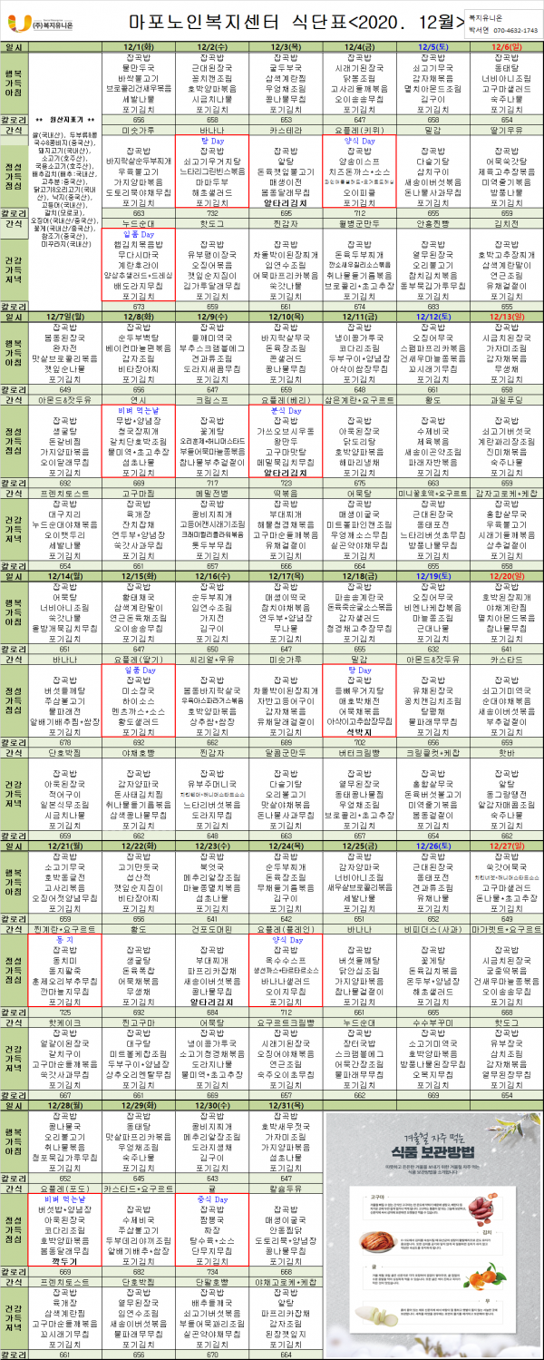 2020년 12월 식단표 안내 페이지 정보 작성자 마포노인 작성일20-12-03 10:08 조회1,355회 댓글0건 관련링크 이전글 다음글 목록 본문 2020년 12월 식단표 안내 댓글목록 등록된 댓글이 없습니다. 이전글 다음글 목록