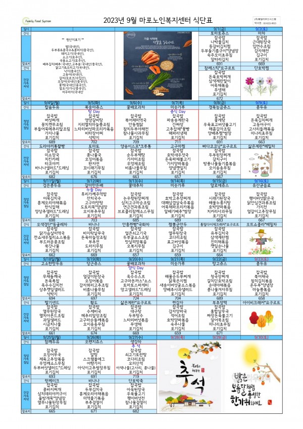 2023년 9월 식단표 페이지 정보 작성자 마포노인 작성일23-08-31 16:18 조회859회 댓글0건 관련링크 이전글 다음글 목록 본문 2023년 9월 식단표 안내드립니다. ^_^ 댓글목록 등록된 댓글이 없습니다. 이전글 다음글 목록