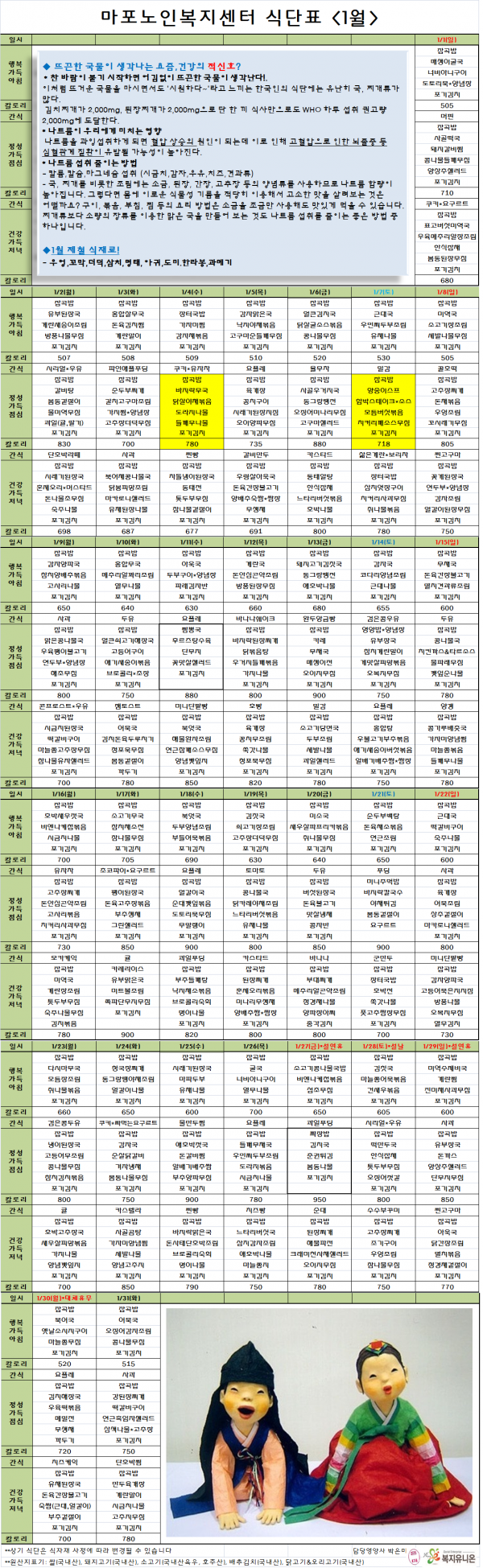 2017년 1월 식단표 입니다. 페이지 정보 작성자 마포복지 작성일17-01-02 18:30 조회1,653회 댓글0건 관련링크 이전글 다음글 목록 본문 마포노인복지센터 1월 식단표 안내입니다. 댓글목록 등록된 댓글이 없습니다. 이전글 다음글 목록