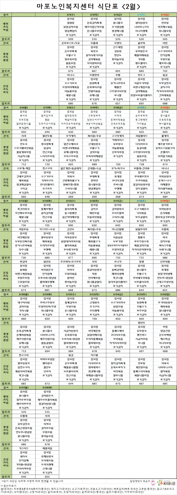 2017년 2월 식단표입니다. 페이지 정보 작성자 마포복지 작성일17-02-01 18:11 조회1,659회 댓글0건 관련링크 이전글 다음글 목록 본문 마포노인복지센터 2월 식단표입니다. 댓글목록 등록된 댓글이 없습니다. 이전글 다음글 목록