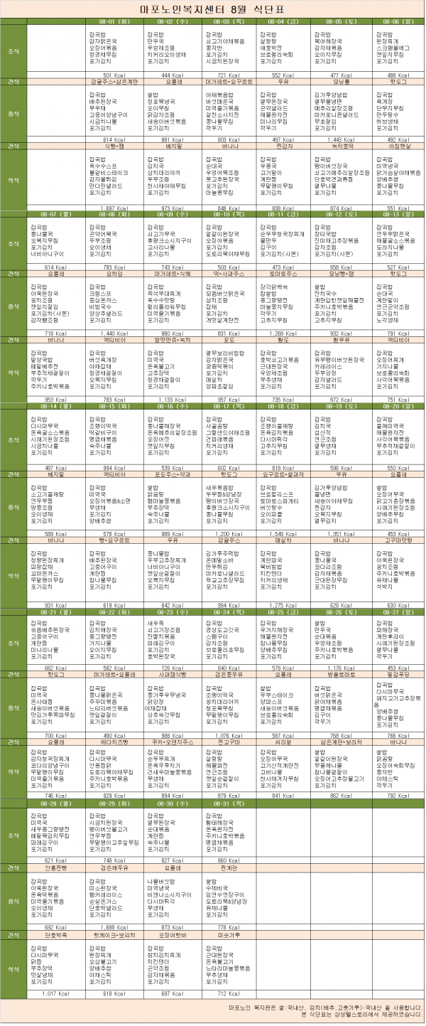 2017년 8월 식단표 입니다. 페이지 정보 작성자 마포복지 작성일17-08-03 11:12 조회1,552회 댓글0건 관련링크 이전글 다음글 목록 본문 8월 식단표 안내입니다. 댓글목록 등록된 댓글이 없습니다. 이전글 다음글 목록