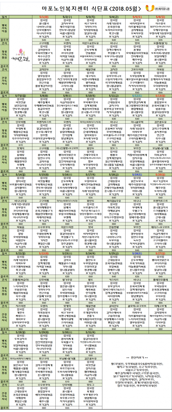 2018년 5월 식단표입니다. 페이지 정보 작성자 마포복지 작성일18-05-02 12:17 조회1,775회 댓글0건 관련링크 이전글 다음글 목록 본문 마포노인복지센터 4월 식단표 안내입니다. 댓글목록 등록된 댓글이 없습니다. 이전글 다음글 목록