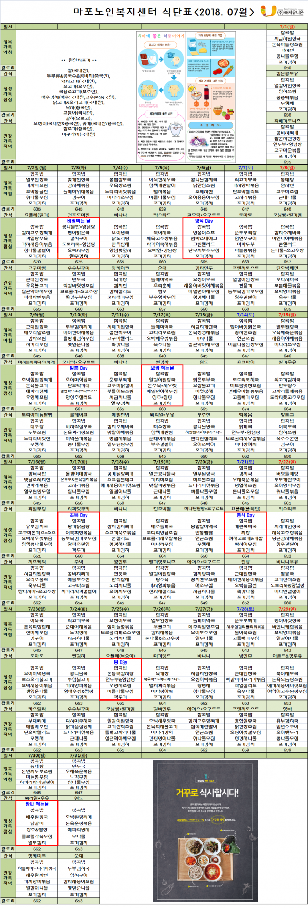 2018년 7월 식단표입니다. 페이지 정보 작성자 마포복지 작성일18-07-02 11:43 조회1,579회 댓글0건 관련링크 이전글 다음글 목록 본문 마포노인복지센터 7월 식단표 안내 댓글목록 등록된 댓글이 없습니다. 이전글 다음글 목록
