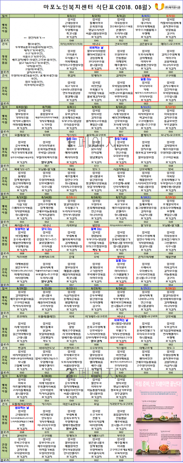 2018년 8월 식단표 입니다. 페이지 정보 작성자 마포복지 작성일18-08-01 18:48 조회1,540회 댓글0건 관련링크 이전글 다음글 목록 본문 마포노인복지센터 8월 식단표 안내 댓글목록 등록된 댓글이 없습니다. 이전글 다음글 목록